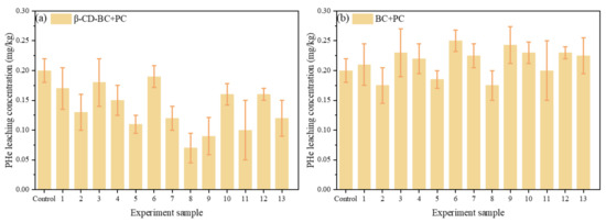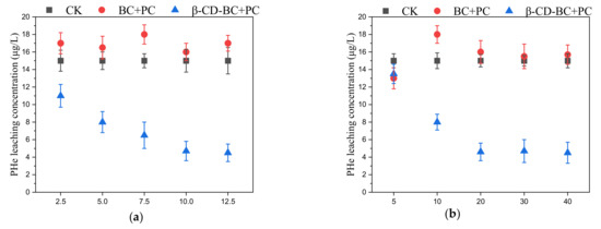 As shown in Figure 4a, BC and β-CD-BC were added to the soil for maintenance at the mass ratios of 2.5%, 5%, 7.5%, 10%, and 12.5%. The leaching rate of PHE in the cured BC/PC samples was higher than that in the blank group, which may be due to the hydrophilic environment of PC, which increased the leaching concentration of PHH in the soil. With the increase of β-CD-BC, the leaching concentration of PHe in the soil gradually decreases until it becomes stable, because the cyclodextrin cavity on the surface of BC is hydrophobic and has a good adsorption effect on PHe. Through the above experiments, β-CD-BC can effectively reduce the leaching concentration of PHe in the soil and has a good stabilizing ability. As shown in Figure 4b, the PHe leaching concentration of the sample cured by β-CD-BC + PC reached a stable level after 20 d.