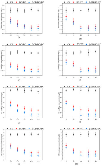 As shown in Figure 5, BC and β-CD-BC were added to the soil for curing according to the mass ratios of 2.5%, 5%, 7.5%, 10%, and 12.5%. The leaching concentration of HMs in BC + PC samples was higher than that in the blank group. The oxygen-containing functional groups on the surface of BC can chelate and cooperate with HMs in soil, to reduce the leaching concentration of HMs in soil. BC has developed a pore structure and can adsorb HMs on the surface. The leaching concentration of HMs in the β-CD-BC + PC cured sample is lower than that of the blank group and BC + PC. This is because the hydroxyl and carboxyl functional groups on the surface of BC are modified by β-CD, which greatly improves the performance of the material. The chelation between HMs and hydrophilic functional groups enhances their stability. Meanwhile, PC can change the pH value of the soil, increase the content of -OH in the soil, and cause the co-precipitation of HMs and -OH [23]. Therefore, β-CD-BC significantly enhances the adsorption capacity of HMs.