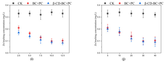 Effects of different BC and β-CD-BC addition amounts and curing times on HMs leach-ing concentration. (a) Addition amount and (b) Curing time for Cd leaching concentration; (c) Addition amount and (d) Curing time for Cr leaching concentration; (e) Addition amount and (f) Curing time for Cu leaching concentration; (g) Addition amount and (h) Curing time for Pb leaching concentration; (i) Addition amount and (j) Curing time for Zn leaching concentration.