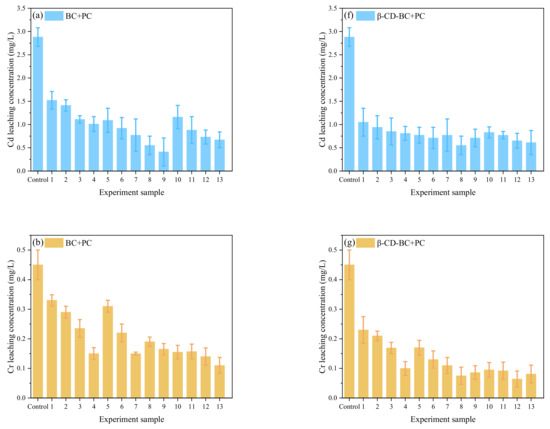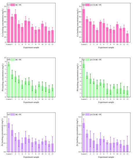 It can be seen from Figure 7 that under the condition of the same reagent addition ratio, the HMs leaching concentration of comparison samples 1 and 10, samples 2 and 11, samples 3 and 12, samples 4 and 13 decreases with the increase of curing time. When the control samples were cured for 20 days, the HMs leaching concentration decreased with the increase of PC and BC. With comparing (a) and (f), (b) and (g), (c) and (H), (d) and (I), respectively, (e) and (J), it can be found that the leaching concentration of HMs treated with β-CD-BC is lower than BC.