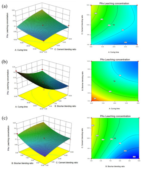 Leaching concentration of PHe. (a) Curing time and biochar blending ratio. (b) Biochar blending ratio and cement blending ratio. (c) Curing time and cement blending ratio.