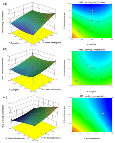 Leaching concentration of HMs. (a) Curing time and biochar blending ratio. (b) Biochar blending ratio and cement blending ratio. (c) Curing time and cement blending ratio.