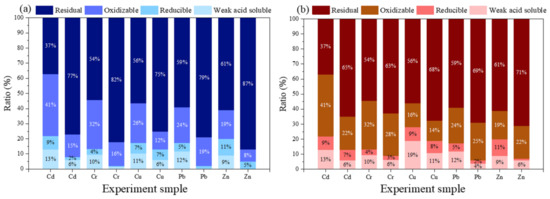 Speciation characteristics of HMs, (a) β-CD-BC + PC, (b) BC + PC.