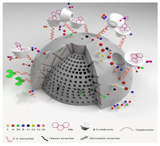 In short, as shown in Figure 11, β-CD-BC achieves the adsorption of PHe through hydrophobic effect and π-π interaction, and enhances the adsorption of Pb, Cu, Cr, Cd, and Zn through complexation and electrostatic attraction [28]. This avoids the competition between the two pollutants for adsorption sites and improves the adsorption performance and adsorption capacity of BC.