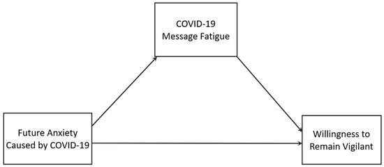 Anxiety about the future due to COVID-19 may increase another specific type of fatigue—message fatigue. Message fatigue refers to the state of feeling tired of repeatedly receiving similar messages on a given topic [18]. In consideration of the fact that heightened future anxiety due to COVID-19 has been shown to increase fatigue [30,31], future anxiety could also place people in the state of feeling exhausted and worn out upon being heavily exposed to seemingly repetitive messages concerning COVID-19 [41]. This would be highly likely to happen as the pandemic drags on for an extended period of time and people are exposed to news and public health messages related to COVID-19 over and over. Along this line of reasoning, we hypothesized the following:
