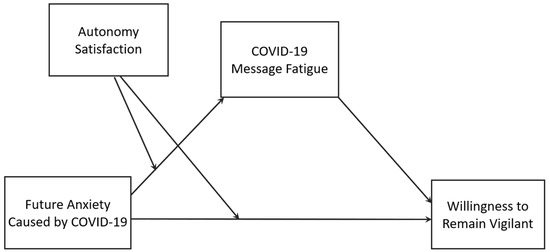 In an effort to fill the gap in the extant research on psychological and behavioral responses to the COVID-19 pandemic, the present research investigated the relationship between future anxiety due to the COVID-19 pandemic and willingness to remain vigilant, focusing on a time period when the pandemic-related restrictions were relaxed following multiple major surges—approximately three weeks after the CDC’s announcement of revised mask-wearing and social distancing guidelines. In examining the relationship between future anxiety and willingness to remain vigilant, we tested message fatigue [18,19] as a possible mediator and autonomy satisfaction [20] as a possible moderator. Our approach was informed by psychological reactance theory and self-determination theory. We drew from psychological reactance theory [21,22] to understand the role of message fatigue in the relationship between future anxiety and willingness to remain vigilant, and we explored the possible moderating role of autonomy satisfaction with the self-determination theory framework [20,23,24,25] as our guide.
