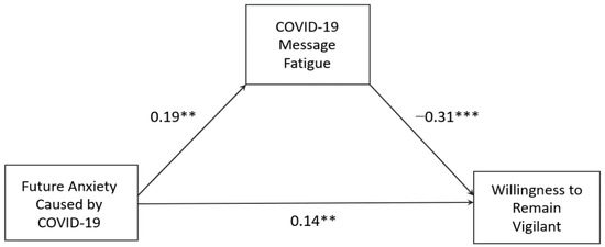 The indirect relationship between future anxiety and willingness to remain vigilant through COVID-19 message fatigue is negative.