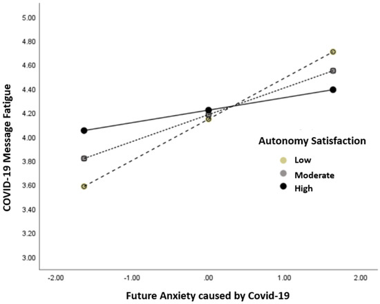 The link between future anxiety due to COVID-19 and message fatigue may be moderated by autonomy satisfaction as an individual difference trait that varies from person to person, as perception of freedom threat is fundamentally connected to the extent that one perceives his/her autonomy satisfied or thwarted [43,44]. According to self-determination theory [45], which explains how innate psychological needs drive people to exercise their ability to manage and regulate themselves [46], autonomy—the need to actualize the self as the core source of action through freedom [46,47]—is a psychological need that can facilitate behavioral regulation when satisfied and supported [46,48,49].