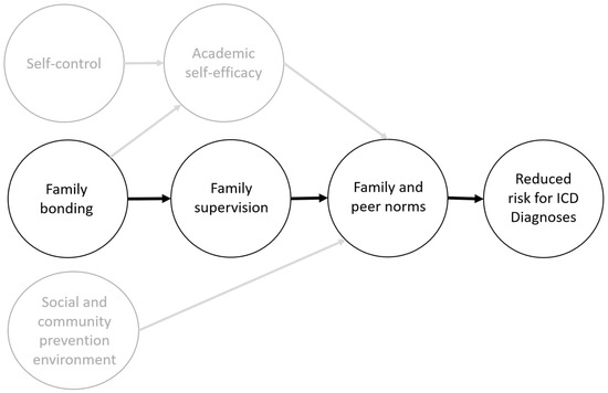 The SFP, developed in 1982 by Dr. Karol Kumpfer as part of a National Institute on Drug Abuse grant, was originally created to prevent substance abuse by strengthening family and parenting skills. It was nationally and internationally implemented and yielded positive outcomes not only in the reduction of substance abuse [14,15] but also for internalizing and externalizing problem behavior [16,17]. The SFP is based on two main theories: the family systems theory by Bowen [18] and the social learning theory by Ban-dura [19]. Applying the structural equation model, Kumpfer et al. [20] found that the pathway of family bonding, parental supervision, and communication of positive values and expectations was most predictive of a reduced risk for ICD diagnoses (Figure 1).