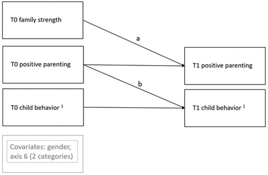 To test the program’s mechanism of change, a half-longitudinal model proposed by Cole and Maxwell [32] for testing mediation with two time points was used. This model is an auto-regressive, cross-lagged path model. In sum, four models were separately tested for each child behavioral outcome (i.e., aggressive behavior, hyperactivity, prosocial behavior, and concentration). To test the indirect or mediation effect (Path a × b) on the child behavioral outcome, Path a of the model was tested by regressing T1 parents’ positive parenting on T0 family strength. Path b of the model was tested by regressing T1 child behavioral outcome on T0 positive parenting. A simplified graphical illustration of the half-longitudinal model is shown in Figure 2.