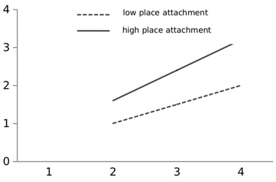 To visualize the moderating role played by place attachment in the relationship between residential satisfaction and settlement intentions, this study plotted the moderating relationship based on the method recommended by Aiken and West [57]. Each chosen variable had one standard deviation above and below the mean. Further, the moderating relationship is plotted in Figure 2, and shows the difference in the relationship between residential satisfaction and settlement intentions when young talent has different levels of place attachment to the city. With greater place attachment, a slight change in residential satisfaction promotes an increase in urban settlement intentions. Conversely, a weaker place attachment weakens the positive impact of residential satisfaction on urban settlement intentions.
