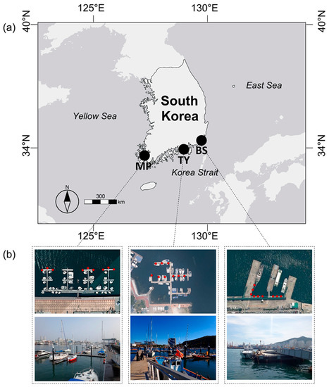 This study was conducted in three regions across two provinces (Jeollanam-do and Gyeongsangnam-do) in the southern part of the Korean Peninsula, and three research sites with different sea area characteristics. Specifically, the sites were the Mokpo Yacht Marina (34°47′2.70″ N, 126°23′21.05″ E) in Mokpo City located in Jeollanam-do (hereafter MP), the Marine Sports Center (34°49′38.80″ N, 128°26′4.22″ E) in Tongyeong City located in Gyeongsangnam-do (hereafter TY), and Busan Port Passenger Terminal (35°5′56.41″ N, 129°2′19.40″ E) in Busan City located in Gyeongsangnam-do (hereafter BS). MP is in the Yellow Sea area affected by the Korean coastal current; TY and BS are in the Korean Strait affected by the Tsushima warm current. MP is affected by the Korean coastal current flowing from the north during winter, and the coastal currents are weakened by the influence of monsoon winds in summer [47,48]. The Kurushio current, which affects TY, provides warm water in summer and is highly salinity. [49,50,51,52]. BS is affected by the Tsushima warm current and the freshwater discharge of the Nakdong River [52]. The selected study sites are places where yachts and ships are loaded in the harbor, and various artificial structures, such as port walls and floating docks, exist. Three points were selected (for replicates) on each study site, and artificial substrates were installed at a depth of 3–4 m (Figure 1).