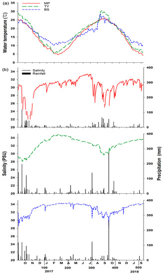 Daily average water temperature results (a) and daily average salinity (red line: MP, green line: TY, blue line: BS) and precipitation (vertical bar) results (b) for each site during the study period.