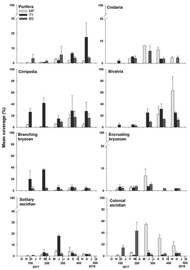 A two-way ANOVA analysis was performed with time and substrates for each taxon to determine whether there was a difference in substrates over time for each survey site. The analyses showed that in MP, coverage of Cirripedia and colonial ascidians exhibited a significant difference according to substrates and time (p < 0.05). In TY, only Bivalvia was significantly different (p < 0.05). In BS, Cirripedia and Bivalvia were significantly different (p < 0.05). Except for Cirripedia, Bivalvia, and colonial ascidians, there was no difference in any other taxa in the study sites (Table 2).