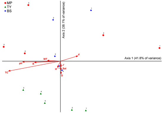 The PERMANOVA results indicated a significant difference between the two factors (three sites and four substrates) over the entire study period. Comparison of differences between sites was significant (p = 0.0001), and differences between substrates were not (p = 0.0615). There was no significant interaction between the two factors (site × substrate; p = 0.2253). In overall individual pairwise tests, only MP vs. TY (p = 0.000) and TY vs. BS (p = 0.004) had significant differences, and other factors did not show significant differences (p > 0.05). The overall PERMDISP for testing the homogeneity of dispersions revealed significant differences only MP vs. BS (p = 0.020), and stone vs. iron (p = 0.046). For all other factors, PERMDISP generated p values > 0.05. Therefore, there was a significant difference in the benthic communities at each site (except MP vs. BS), but no difference between each substrate (except stone vs. iron; Table 1 and Table S5). The nMDS analysis was conducted with nine quantitative variables (H’: Shannon diversity index, D: Simpson dominance index, J’: Pielou evenness index, d: Margalef richness index, R: species richness, TC: total coverage, WT: water temperature, Sal: salinity, and pH) and two categorical variables (sites and times) based on the sessile benthic invertebrate communities. The variances of axes 1 and 2 were 41.8% and 38.1%, respectively, and axis 1 appeared to be divided by time, and was inferred to be affected by TC, pH, R, and WT (Figure 4). The MRPP analysis comparing the surveyed sites showed a significant difference between MP and TY (p = 0.00369) and TY and BS (p = 0.00979), but not between MP and BS (p = 0.36589; Table S4).