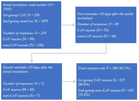 Among them, 250 frontline nurses were reassigned to work in the hospital COVID-19 unit treating the most severe cases of patient with COVID-19 disease (Group 1), while 1055 were working in non-COVID-19 departments treating patients who were seeking hospital care for symptoms of diseases other than COVID-19 disease (Group 2) during the first pandemic wave. The groups were formed according to the answer to the question “Did you work at a COVID-19 department during the coronavirus pandemic?”
