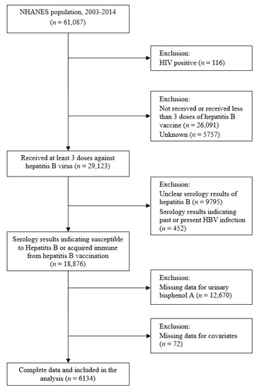 Data from six cycles (2003–2004, 2005–2006, 2007–2008, 2009–2010, 2011–2012, and 2013–2014) of the NHANES, a stratified random sample survey designed to be representative of the US population, were pooled. The selection of study participants is summarized in Figure 1. Of the 61,087 NHANES respondents, we excluded the following: those who tested positive for HIV (n = 116) and were likely to be immunocompromised, those who had not received at least three doses of hepatitis B vaccine (n = 26,091), and those whose vaccination status was unknown (n = 5757). We also excluded those with unclear serologic results for hepatitis B (n = 9795) or those with serologic results suggestive of past or present HBV infection (n = 452). Finally, after excluding those with no BPA concentration data (n = 12,670) or with missing potential covariate data (n = 72), the data of 6134 participants were analyzed.