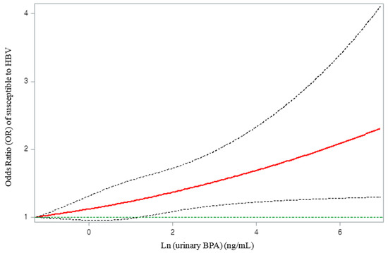 The spline curve of the dose–response relationship of the “susceptible to HBV” group according to the urinary BPA concentration is shown in Figure 2. A monotonic increase in the OR for “susceptible to HBV” was observed with an increase in the urinary BPA concentration (Figure 2).