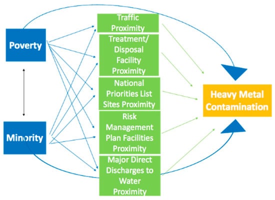 Our analyses suggest that areas with a higher population of minorities have an increased exposure to heavy metal contamination in their environments. Though, on a lesser scale, there is also significant risk of select heavy metals for poverty-stricken areas. Path analyses also revealed that these relationships were mediated by proximity to emissions sources, confirming the pathways of SES/race -> proximity to emission sources -> soil–metal contamination.