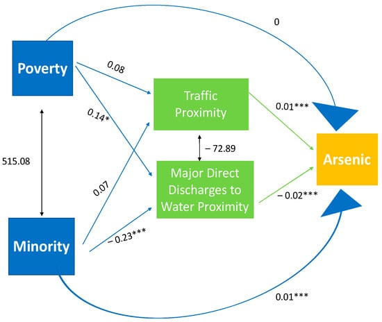 Standardized path coefficients for trimmed path diagram of heavy metal contamination. The figure shows the trimmed path model with nonsignificant paths deleted from model. This depiction clearly displays which paths, poverty, minority, and environmental factors are related to increased exposure to arsenic. Notes: *** indicate significance at <0.001; * indicate significance at <0.05. Double-headed arrows indicate covariance. Single-headed arrows indicate path coefficient in relation to arsenic contamination.