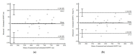 The mean difference between measured and estimated 6MWD calculated using the equation developed in phase 1 was only −2.1 m (0.6%) with a 95% confidence interval (95%CI) from −110.4 (−17.4%) to 106.2 (16.1%) (Figure 1a,b). The correlation between values was strong (r = 0.77; p < 0.001; R2 = 0.59). The ICC was good (0.855: 0.671–0.936), as was the CV (6.1%). Although it did not reach statistical significance, the mean values of 6MWD tended to be positively correlated with the mean difference (p = 0.07).