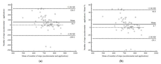 Bland and Altman graphic method with limits of agreement and 95% confidence interval (95%CI) between the accelerometer- and app-based number of steps during the supervised six-minute walk test in 93 subjects enrolled in Phase 1 of the present study. (a) absolute values; (b) percentage values.