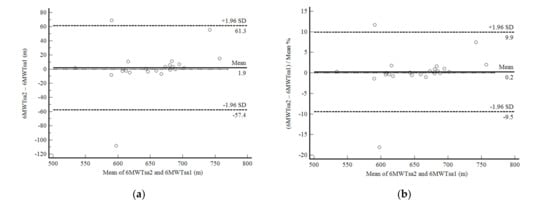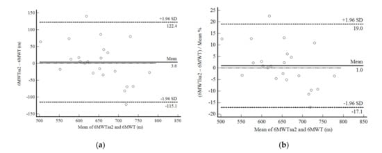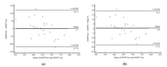 In phase 2 of the study, the self-administered 6MWD showed excellent reproducibility. The 6MWTsa2 was less than two meters different from the 6MWTsa1 (mean difference, 1.94 ± 30.27 m; p 0.761), and the difference was normally distributed. Confidence limits were shallow in 22 of 25 participants and were less than 10% (Figure 3a,b). The correlation between the mean difference and the mean values was not significant. Reliability between measurements was also excellent (ICC, 0.91: 95%CI, 0.81–0.96; CV = 6.4%).