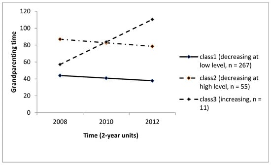 Finally, to examine the relationships between the predictors and the longitudinal patterns of grandchild care, this study ran a multinomial logistic regression because the dependent variable was a three-level nominal measure derived from the GMM analysis as the optimal number of classes. This study also calculated the mean trajectories of grandchild care within each latent class. Longitudinal equation modeling using Mplus (Muthén & Muthén, Los Angeles, CA, USA) [] was performed.