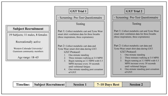 The experimental flow chart outlining the study design is shown in Figure 1. This validation study was conducted on the WCU campus in the High Altitude Performance Lab (HAP Lab) in Gunnison, Colorado, United States (2348 m). The study consisted of two trials of a GXT that were separated by 7 to 10 days to allow for adequate rest between sessions. Exact rest days were determined based on scheduling availability of the researcher and subject. Two days prior to the initial GXT in trial 1, subjects were provided pre-test instruction and allowed to keep a copy of the instructions as a reminder for the second test. Pre-test questionnaires (Appendix A) were completed prior to all tests to screen subjects for readiness. Subjects whose GXT did not meet the criteria of completion were given the option to: (1) complete an additional GXT 7–10 days after the test; (2) choose to no longer participate in the study.