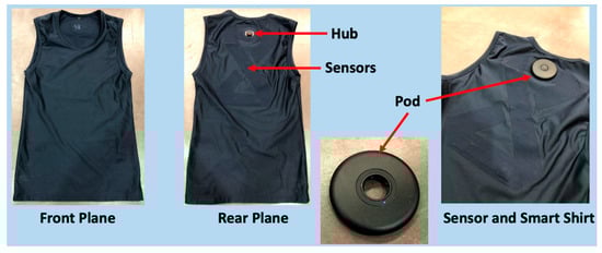 Subjects were given a pre-test questionnaire that determined the subject’s GXT readiness. The questionnaire was developed based upon variables that could influence the outcome of the GXT. Furthermore, this questionnaire allowed the subjects to replicate preparatory conditions (exercise, diet, etc.) for the second GXT session. If subject met all requirements for testing, they were prepared for the GXT. In order to collect heart rate data, subjects were fitted with a chest strap heart rate monitor (WearLink, Polar USA, Worcester, MA, USA). Subjects were then provided a smart shirt (Tyme Wear smart shirt, Tyme Wear, Boston, MA, USA) that was fitted according to the sizing guides provided by Tyme Wear. The Tyme Wear pod was subsequently attached to the hub of the smart shirt (refer to Figure 2 for external layout of shirt).