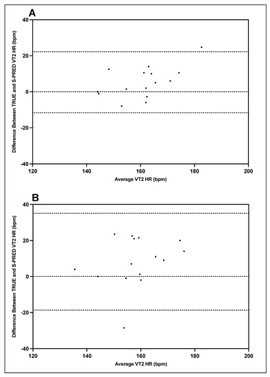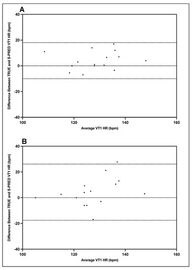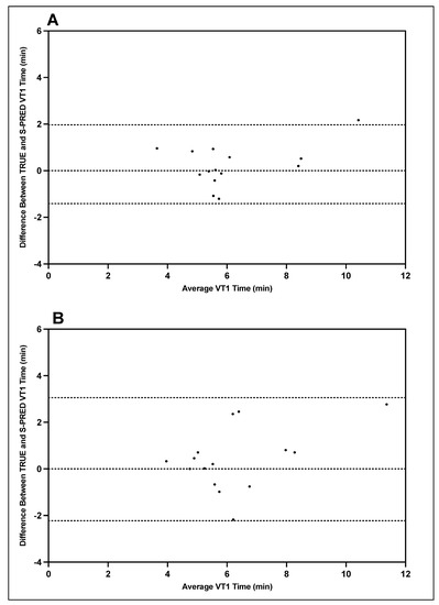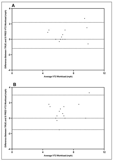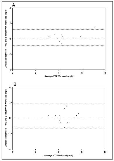 The data presented in Table 4 suggest that S-PRED underestimates the timepoint, workload, and heart rate values corresponding to VT1 and VT2 when compared to TRUE. Furthermore, the bias and wide limits of agreement revealed in the Bland–Altman plots suggest that the agreement between TRUE and S-PRED is less than optimal for VT1 and even less so for VT2. The difference in workload is approximately 2–3% and 5–9% between TRUE and S-PRED VT1 and VT2, respectively, as observed in Table 6. For heart rate, the difference is approximately 2% and 2–5% between TRUE and S-PRED VT1 and VT2, respectively, as observed in Table 5. This translates to a workload difference of 0.2–0.3 and 0.5–0.9 mph between TRUE and S-PRED VT1 and VT2, respectively. For heart rate, this translates to a difference of 3.7 and 3.7–9.2 bpm between TRUE and S-PRED VT1 and VT2, respectively. As such, it appears that for the cohort in our study, for every 0.3 mph increase, heart rate increases concomitantly by 5–10 bpm.