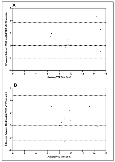 TRUE versus S-PRED VT2 time point; trial 1 (A) and trial 2 (B).