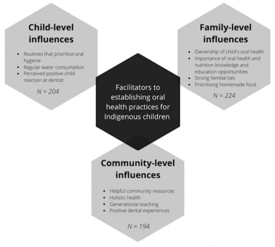Findings from 327 interviews with 226 carers from Indigenous communities across South Australia are presented in the order of the highest to the lowest number of participants that discussed themes within each of the following categories: family-level influences (N = 224), child-level influences (N = 204), and community-level influences (N = 194) (Figure 1). In this sample, 28.9% of families were categorised as high SEP, as determined by maternal education, health care card status, ability to pay a AUD 100 dental bill, car ownership, and IRSAD by postal area (Table 2).