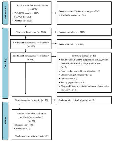 The literature search process and the process for selecting studies are detailed in Figure 1. A total of 3367 studies were identified in the databases. After removing duplicates, 2569 were searched, 2417 of which were then excluded by study title and 112 of which were excluded on the basis of the abstract, leaving 40 studies for the eligibility phase. The full text of these articles was assessed by independent reviewers for eligibility. Fifteen articles were excluded at this stage because they did not meet eligibility requirements for the reasons listed in Figure 1. Following a critical evaluation of the full texts of the articles by consensus, two articles were excluded because it was not possible to define the incidence of depression and anxiety in the analyzed research. Moreover, the decision was made at this stage to include for further analysis only part of the results in an article that evaluated the level of anxiety and depression in nurses during the period of exacerbation and during the stable period of the COVID-19 pandemic [23]. As that article’s research for both periods of the pandemic was conducted with the same group of nurses, it was decided to include only the results obtained during the exacerbation period of the pandemic. In the end, twenty-three studies were used in the qualitative analysis, eighteen of which analyzed the level of depression and twenty-two of which analyzed the level of anxiety.