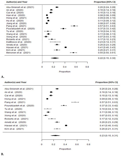 The following are available online at https://www.mdpi.com/article/10.3390/ijerph19031154/s1, Table S1: PRISMA Checklist, Table S2: Search strategy and search terms; Table S3: Quality assessment result of observational studies (n = 23) using the questioner according The Agency for Healthcare Research and Quality (AHRQ); Figure S1: Funnel plot for meta-analysis of the prevalence of depression; Figure S2: Funnel plot for meta-analysis of the prevalence of depression (A: for all tools; B: only for GAD-7).