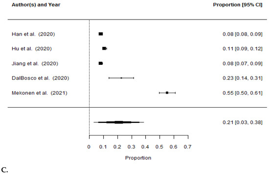 The funnel plot demonstrated a mild asymmetry in prevalence of depression and anxiety (Supplementary Materials, Figures S1 and S2). However, the p-value for the Egger’s test was 0.32 and 0.10 for depression and anxiety, respectively, indicating no, or undetected, publication bias.