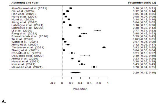 The pooled analysis of the data consisted of cross-sectional studies in an overall group of 44,165 nurses. The goal of our systematic review and meta-analysis was to determine the prevalence of anxiety- and depression-related mental health problems among nurses during the COVID-19 pandemic. Severity levels of anxiety and depression were assessed in twenty-three studies [6,9,23,24,25,26,27,28,29,30,31,32,33,34,35,36,37,38,39,40,41,42,43], the results of which were analyzed. Four articles addressed the incidence of anxiety itself, as well as the factors intensifying it, among working nurses [30,31,36,40]. Meta-analysis indicates that the incidence of depression among nurses during the COVID-19 pandemic is 22% (95% CI = 0.15–0.30, I2 = 99.71%), and the incidence of anxiety is 29% (95% CI = 0.18–0.40, I2 = 99.92%). The considerable heterogeneity of these results should be emphasized. Our discoveries highlight an important issue regarding nurses and their mental health issues during the COVID-19 pandemic.