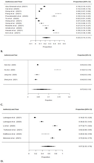 Forest plot for the prevalence of anxiety among nurses: (A) overall result; (B) assessment scale GAD-7; (C) assessment scale SAS; (D) remaining assessment scales, excluding GAD-7 and SAS.