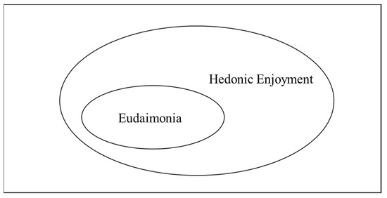 Happiness experienced by individuals can be defined as a combination of positive emotions and life satisfaction [9]. Happiness has been referred to as a broad concept, a comprehensive term that encompasses not only hedonic characteristics [10,11] but also well-being, quality of life, and subjective well-being resulting from experiencing positive emotions, the fulfillment of various needs, and the achievement of goals [12]. Furthermore, happiness affects life satisfaction at different levels of conceptualization. Therefore, the types of happiness can be divided into hedonic enjoyment and eudaimonia. Hedonic enjoyment involves the immediate joy and satisfaction that individuals get from experience, while eudaimonia consists of individuals experiencing self-expressiveness through activities, which means that the experience gives them meaning and self-definition, and they realize their potential [8,13]. Telfer [14] found that a certain level of effort, flow experience, and self-realization were required to experience eudaimonia; therefore, eudaimonia is not a necessary condition for hedonic enjoyment but a sufficient condition, as shown in Figure 1. In other words, not all experiences that can bring about hedonic enjoyment necessarily reach eudaimonia, which is associated with self-maturation and self-development [8]. Moreover, eudaimonia can be expected to give greater meaning and satisfaction to individuals over the long term by denoting self-expressiveness and the possibility of self-realization.