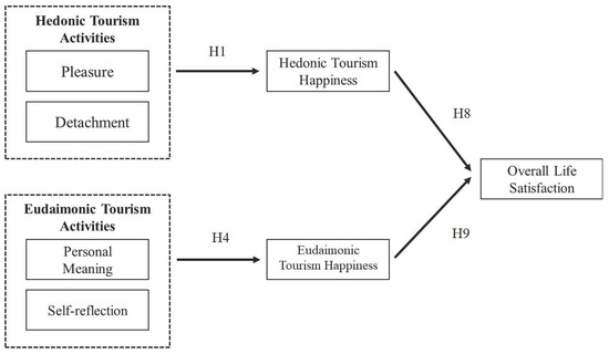 Previous studies related to the happiness experienced by tourists have mainly focused on the hedonic aspects of happiness, which are defined by the frequency and intensity of positive emotional experiences [6]. However, recently, as researchers’ interest in tourist happiness has increased, they have attempted to outline travel happiness in more detail. One of the notable studies on this issue, Nawijn and Filep [7], has divided tourists’ happiness into hedonic and eudaimonic. According to these authors, eudaimonic tourist happiness is defined as travel experience-related happiness that gives tourists not only positive emotions but also meaning and a sense of achievement. However, relatively little effort has been made to identify the integrated impact of tourists’ hedonic and eudaimonic happiness on their overall life satisfaction.