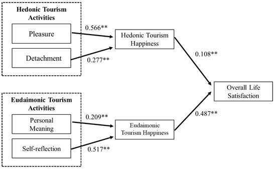 Although hedonic tourism happiness and eudaimonic tourism happiness coexist in tourism experiences, extant research has primarily approached them and their impact on tourists’ life satisfaction separately. Therefore, the purpose of this research is to investigate the impact on life satisfaction of the two types of happiness tourists experience in various activities they encounter in tourist venues and their asymmetric effects. A survey was conducted among tourists who had tourism experiences within a year (October 2018 to September 2019) either abroad or Jeju island, and 736 responses were used in the analysis. Results from structural equation modeling analysis show that most of the hypotheses were supported. Our findings demonstrate that pleasure and detachment experience positively affect hedonic tourism happiness, while personal meaning and self-reflection experiences positively affect eudaimonic tourism happiness. Theoretical and managerial implications are discussed.