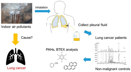 (1) Background: Cooking and burning incense are important sources of indoor air pollutants. No studies have provided biological evidence of air pollutants in the lungs to support this association. Analysis of pleural fluid may be used to measure the internal exposure dose of air pollutants in the lung. The objective of this study was to provide biological evidence of indoor air pollutants and estimate their risk of lung cancer. (2) Methods: We analyzed 14 common air pollutants in the pleural fluid of 39 cases of lung adenocarcinoma and 40 nonmalignant controls by gas chromatography-mass spectrometry. (3) Results: When we excluded the current smokers and adjusted for age, the adjusted odds ratios (ORs) were 2.22 (95% confidence interval CI = 0.77–6.44) for habitual cooking at home and 3.05 (95% CI = 1.06–8.84) for indoor incense burning. In females, the adjusted ORs were 5.39 (95% CI = 1.11–26.20) for habitual cooking at home and 6.01 (95% CI = 1.14–31.66) for indoor incense burning. In pleural fluid, the most important exposure biomarkers for lung cancer were naphthalene, ethylbenzene, and o-xylene. (4) Conclusions: Habitual cooking and indoor incense burning increased the risk of lung adenocarcinoma.