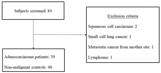 We recruited 43 lung cancer patients and 41 nonmalignant patients with pneumonia, heart failure, pneumothorax, ischemic bowel disease, or Sjogren’s syndrome. After excluding two patients with squamous cell carcinoma, one patient with small-cell lung cancer, one patient with metastatic cancer from another site, and one patient with lymphoma, a total of 79 subjects were included in the final analysis, with 39 cases of lung adenocarcinoma and 40 nonmalignant controls (Figure 2).