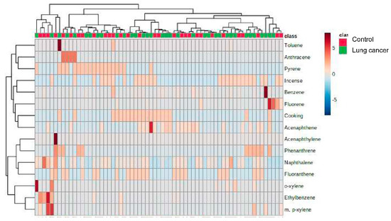 Heatmap of concentrations of exposure biomarkers (PAHs and BTEX in pleural fluid) in lung cancer patients and controls.