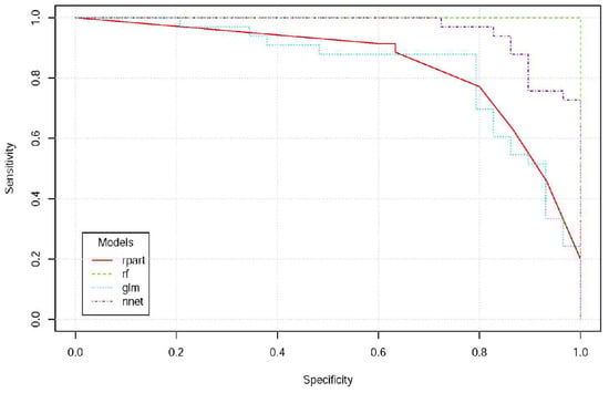 Receiver operating characteristic curves for lung cancer predicted by environmental exposure histories and exposure biomarkers in pleural fluid. We included the prediction variables of environmental exposure histories (lived near the main street, distance to the main street, cigarette smoking, incense burning, essential oil) and exposure biomarkers (PAHs and BTEX in pleural fluid) and used four machine learning algorithms to establish a prediction algorithm. The machine learning algorithms used R packages of the decision tree (rpart), random forests (rf), generalized linear models (glm), and neural networks (nnet). The ROCs ranged from 0.84 to 1.00.