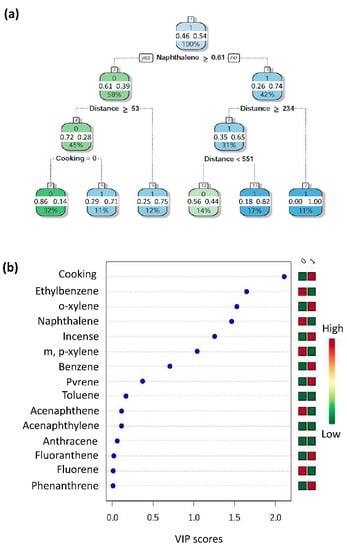 The important environmental factors and exposure biomarkers of lung cancer are determined by (a) decision tree and (b) random forest models showing the variable importance (VIP) score. By the decision tree, the most important factor in predicting lung cancer is the concentration of naphthalene (≥0.61 ppb) in pleural fluid, followed by the distance between the residence and the main street and habitual cooking at home. By random forest, the most important factor for predicting lung cancer is habitual cooking at home, followed by the concentrations of ethylbenzene, o-xylene, naphthalene in pleural fluid, and then habitual indoor incense burning.