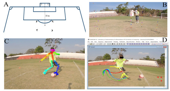 Kicking is a frequent technical action taken in football matches, and achieving high-velocity and accurate targeting standards usually contributes to winning matches [1,2]. Extracting players’ movement kinematics data derived from ball kicking, such as passing actions or shooting against goalposts, is arguably important in the coaching process since it assists in identifying and understanding (a) body mechanical factor determinants for performance outputs; (b) practice constraints’ (e.g., acute-to-chronic exercise or recovery related) effects on coordination aspects [3]; most importantly, (c) individual weaknesses in need of improvement, thereby allowing the provision of specific feedback to refine movement patterns [4]. Currently, among the tools available to examine kicking movement performance, video analysis originates the most objective and sensitive kinematic metrics, which are not always captured by only visual ratings [5]. In fact, video analysis has been used in some other research fields (e.g., animal displacement detection and analysis), as well as in a range of sports [6,7,8,9,10,11,12,13,14]. However, while ecologically valid assessment protocols using an on-field multiple-camera setup (such as high-speed action sport cameras [15]) have made it possible to record the three-dimensional and open nature of soccer kicks, flexible/reliable and boosting image processing methods are still required to provide useful information to practitioners in due time [3,16,17].
