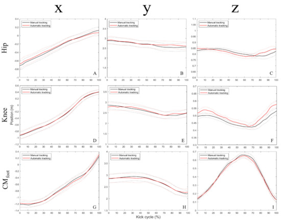 Positional differences were observed between the two methods only in the z-coordinates of the knee (from 6 to 12%; 20% instant and 90 to 100% of kicking movement cycle—Figure 2F) and calcaneus markers (from 16 to 18%—Supplementary online material S1, Figure 1M). Hip (dominant and non-dominant), ankle, fifth metatarsal head and CMfoot (Figure 2G–I) showed no significant differences in their three-dimensional positions (x, y or z coordinates), computed by automatic as compared to manual tracking methods, during the whole kicking movement cycle. Overall effect sizes (Table 1) were trivial to small for the x coordinates (ES = 0.01 to 0.39 (mean = 0.17)) and y coordinates (ES = 0.06 to 0.32 (mean = 0.14)) and small to large concerning z coordinates (ES = 0.34 to 6.40 (mean = 1.59)).