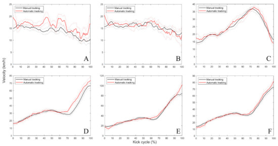 Time series containing median values (solid lines) and associated confidence intervals of marker’s resultant three-dimensional velocity computed across the whole kick movement cycle for both tracking methods (non-dominant hip (A), dominant hip (B), knee (C), calcaneus (D), fifth metatarsal head (E) and CMfoot (F)).