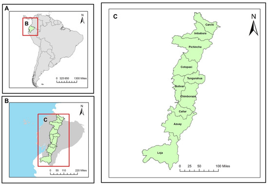 Study area: (A) geographical location of Ecuador; (B) Andean Region of Ecuador; (C) provinces belonging to the Andean region.